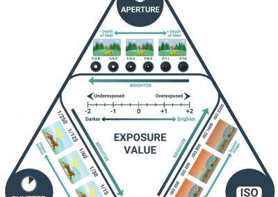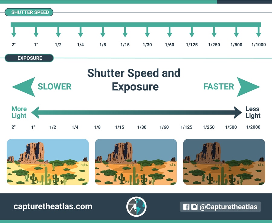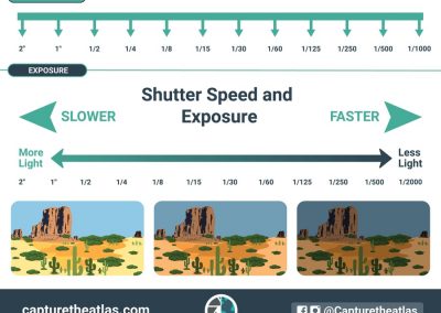 - Example: 1/1000 sec freezing sports vs 1/10 sec creating motion blur in water.