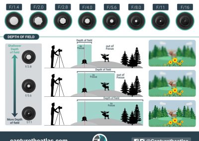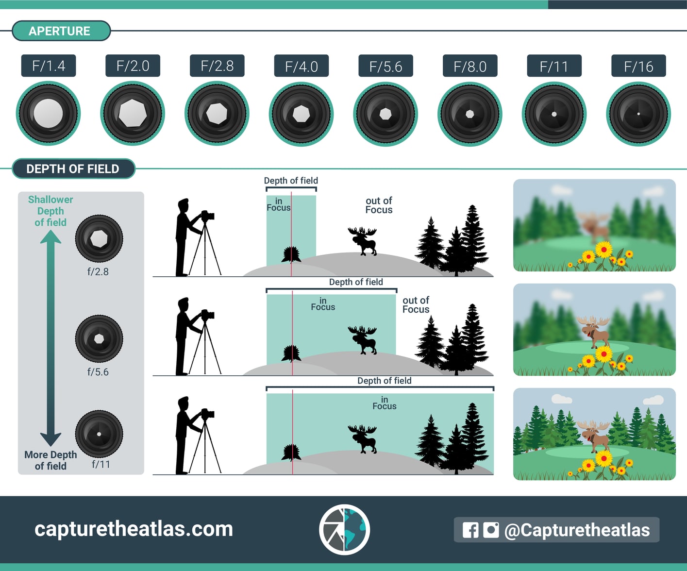 - Example: f/2.8 portrait with blurry background vs f/11 landscape sharp front to back.