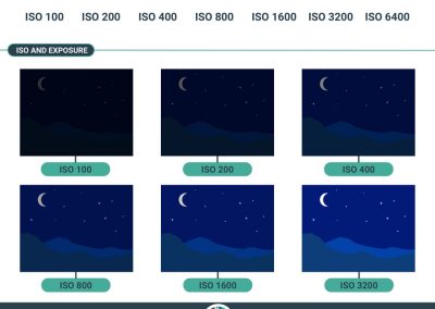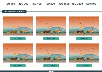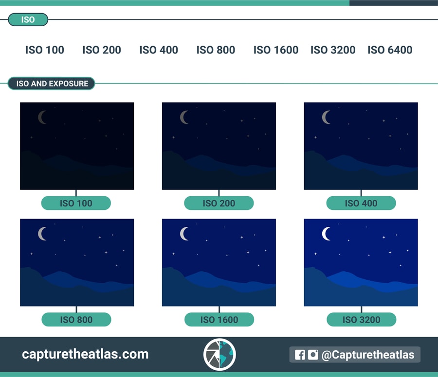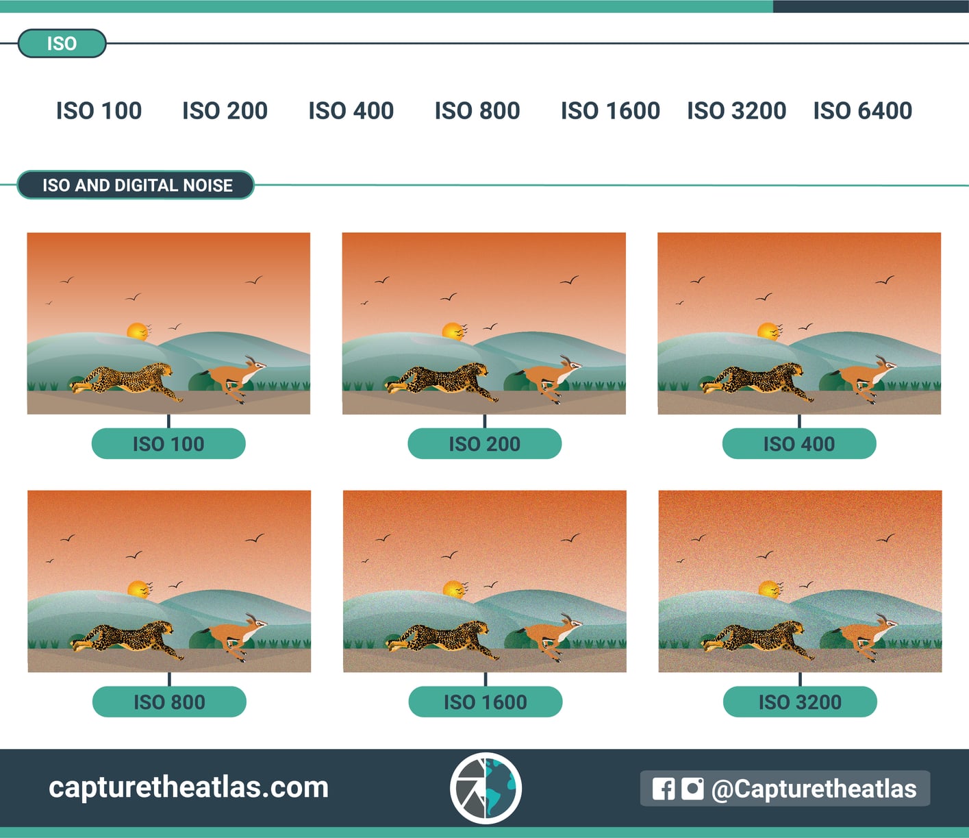 - Example: ISO 100 in daylight (clear) vs ISO 3200 in low light (grainy).